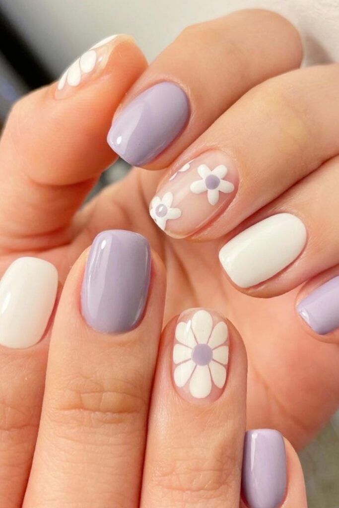 Prepare your nails with the base coat. Apply the lavender polish on the thumb, middle, and pinky fingers, and a white polish on the others. On the accent nails, create flower designs with the lavender polish, adding white dots for detail. Finish with a quick-drying top coat for a flawless look.