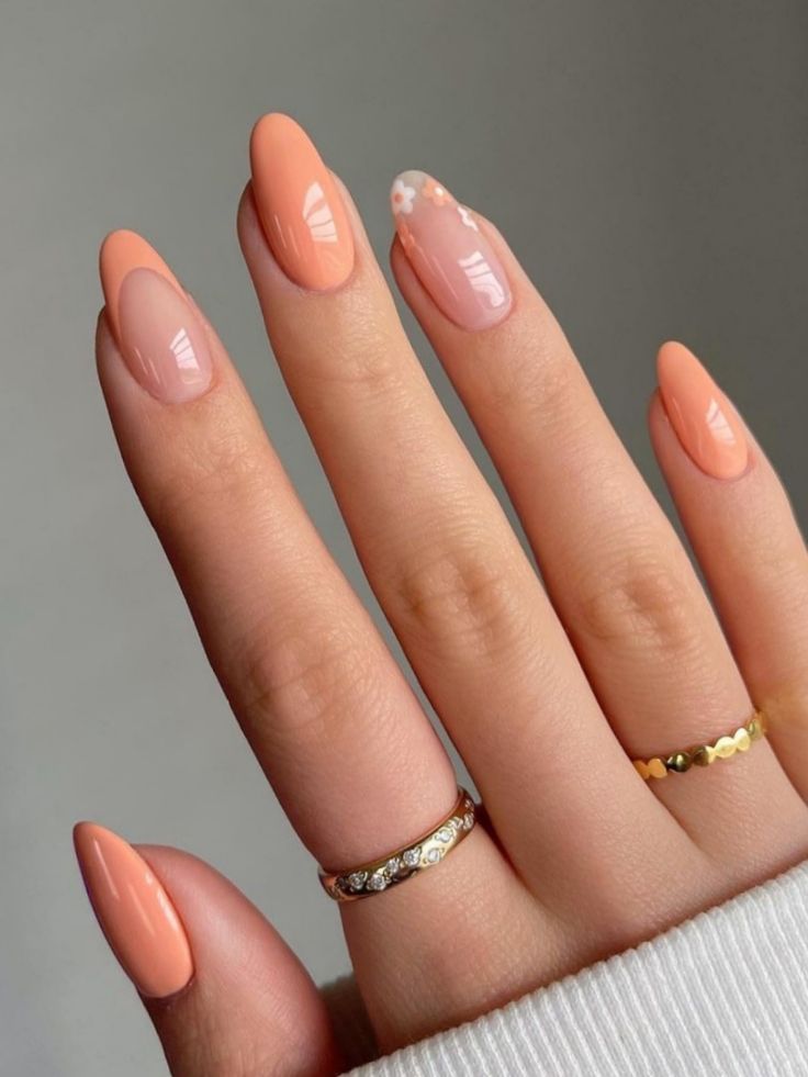 Prep with a base coat to ensure your mani lasts. Apply two coats of the peach polish across all nails, save for the ring finger. Here, use a dotting tool or a thin brush to create a simple floral pattern with white polish. Seal the deal with a glossy top coat, and enjoy your fresh, peachy look!