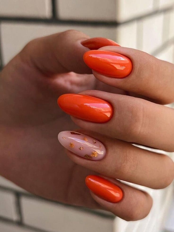 Start with a solid base coat. Paint four fingers with the zesty tangerine and the ring finger with the soft lilac. While the lilac is still tacky, delicately place gold flakes for an opulent touch. Once everything’s dry, apply a glossy top coat for a durable and shiny finish.