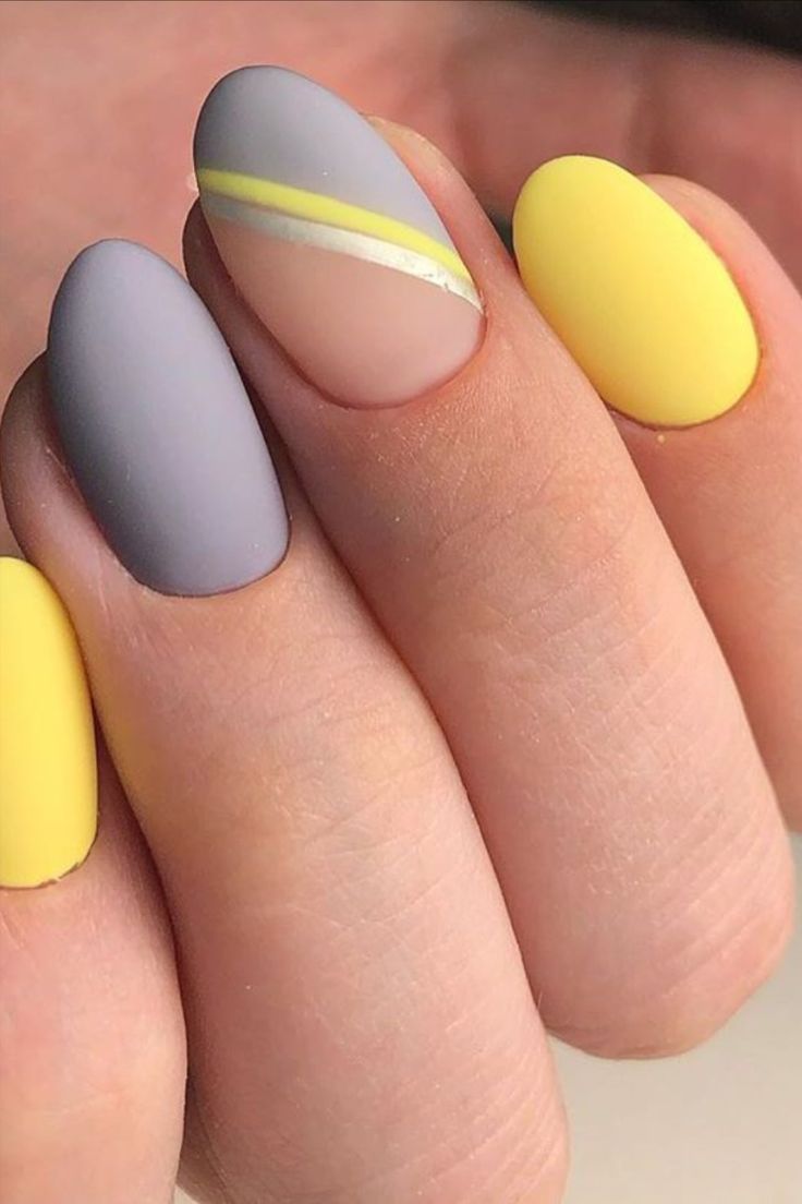 Begin with a base coat to protect the nail. Apply two coats of yellow on the thumb, index, and pinky fingers, and grey on the middle and ring fingers. Once dry, apply a gold striping tape on the grey nails. Finish with a matte top coat to ensure the look stays modern and on-trend.