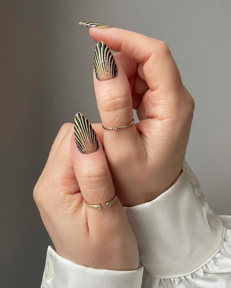 The dynamic stripes in photo were likely achieved using fine-tip nail art brushes and black nail polish for precision. The artist may have used a matte top coat over a nude polish base to create a contrast that allows the stripes to stand out with a high-gloss finish.