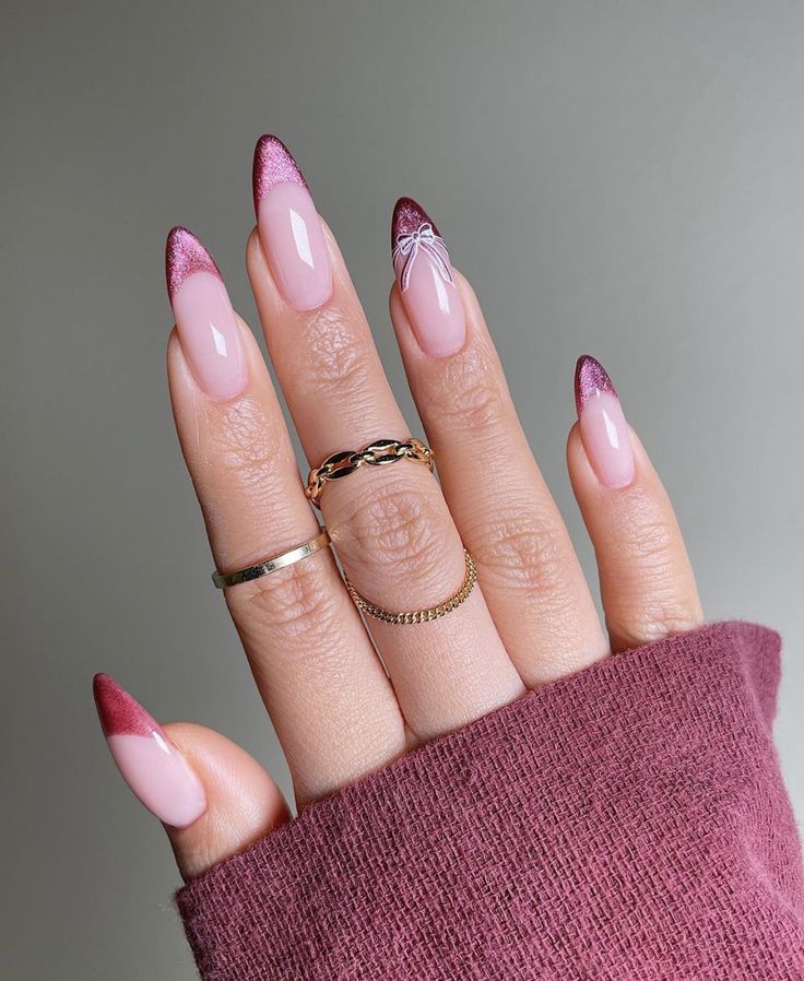 The glitter outlining in indicates the use of a fine glitter liner brush or a pre-made glitter striping tape. The nails were probably painted with a sheer base coat first, then meticulously outlined with the glitter to create that crisp, sparkling edge.