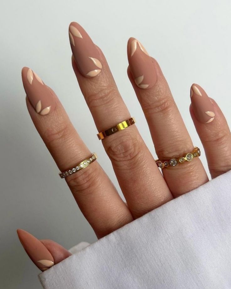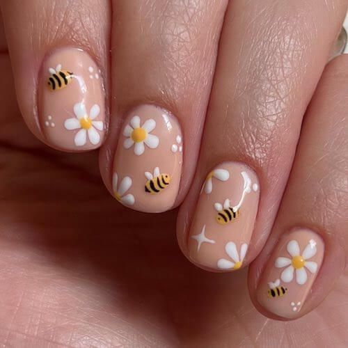In we find a playful interaction between nature and art. The nails are a canvas where dainty daisies and busy bees come to life. This design is a lively celebration of the season’s dynamism, with bees symbolizing activity and daisies representing purity. A base of nude polish sets a natural backdrop, allowing the white and yellow details to pop. This nail art is a perfect conversation starter and a joyful addition to any spring outfit.