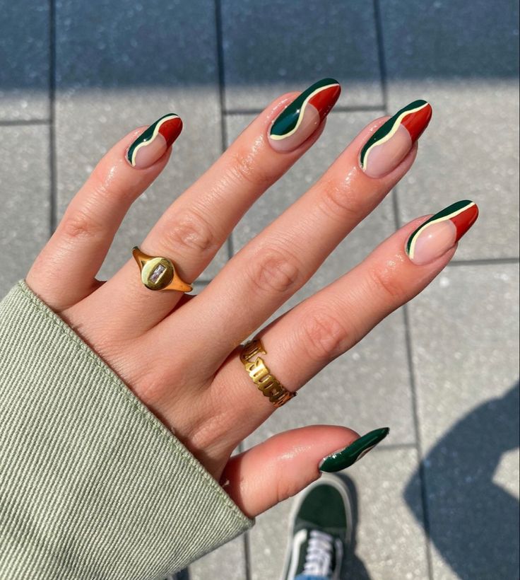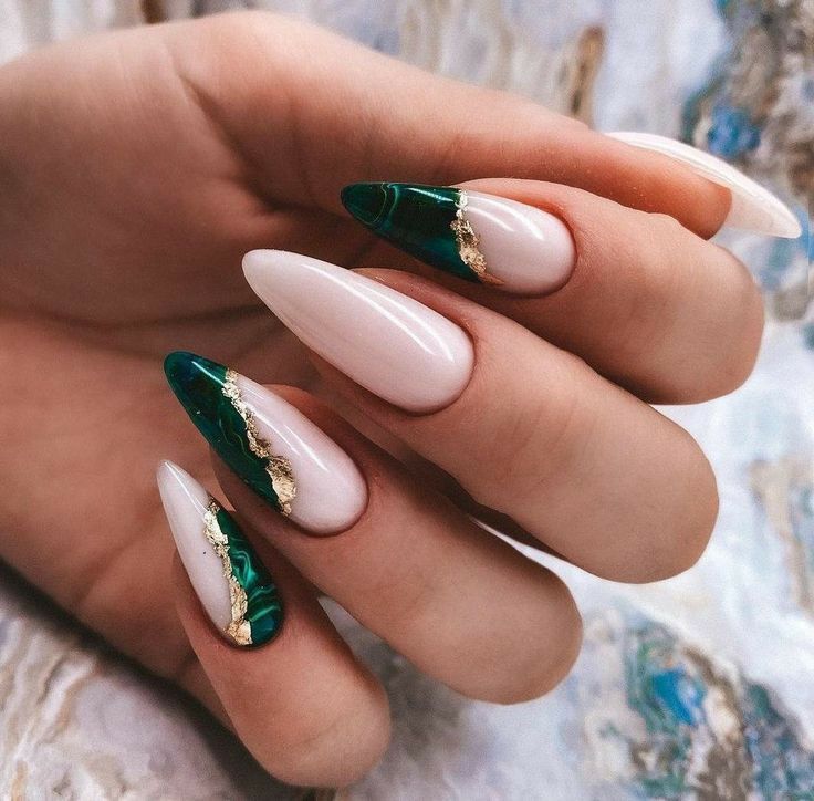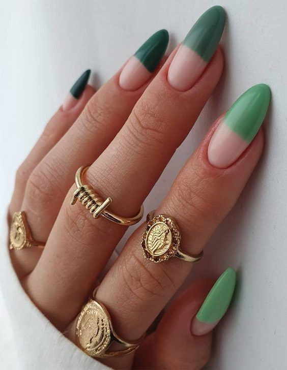 The two-toned design in may have been crafted using masking techniques or nail vinyls to keep the lines sharp between the green and nude polish. A high-quality cream polish would have been used for the solid color areas, giving a smooth, opaque finish.