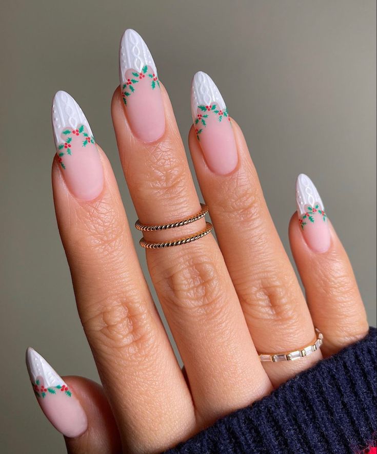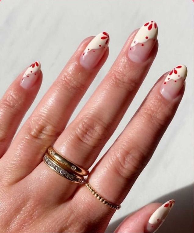 Floral patterns are a staple of spring, and takes this trend to the nails with a modern twist. The nails exhibit a sleek white base, accented with tiny red flowers and green leaves that seem to grow from the nail beds. It’s a bold yet refined way to wear florals, offering a touch of elegance to any ensemble, be it casual or formal.