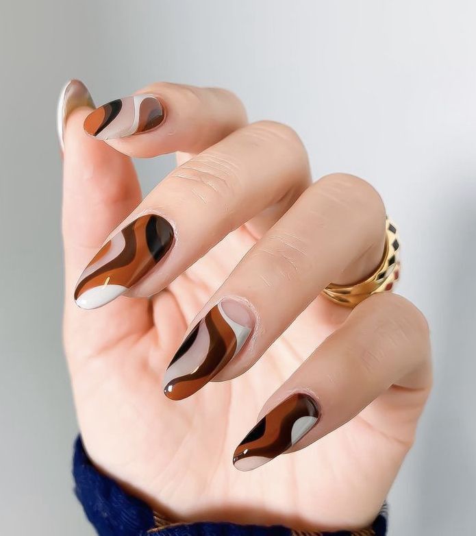 The marble effect seen in suggests a water marbling technique, where drops of brown and white polish are added to water, swirled into a design, and then transferred onto the nail. This would have been followed by a top coat to smooth out the design’s surface.