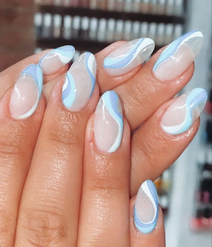 Spring’s clear blue skies and gentle breezes are encapsulated in photo. Here, nails become the embodiment of the sky itself, with swirls of white and blue creating a marbled effect. The lightness of the design evokes the feeling of a soft wind, making it a perfect match for airy spring dresses and light scarves. This nail art design is for those who carry the sky’s tranquility with them.