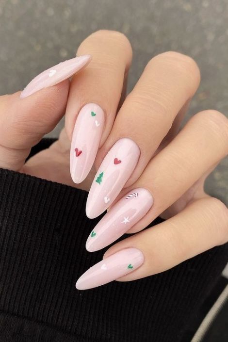 As if attending a secret garden party, showcases nails with a mix of heart shapes, flowers, and soft green leaves, creating a narrative of romance and enchantment. This design is for the dreamer, the one who carries a garden of stories on their fingertips.