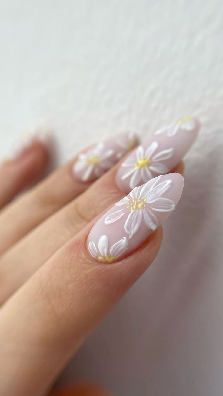 The first breath of spring is often captured by the delicate touch of pastels. The file showcases nails painted in a soft pink hue, reminiscent of cherry blossoms. The nails are adorned with intricate white flowers, their petals unfolding gracefully, accented by a touch of yellow at the center. It’s a style that whispers the gentleness of spring and is perfect for those who appreciate a subtle nod to the season’s floral tapestry.