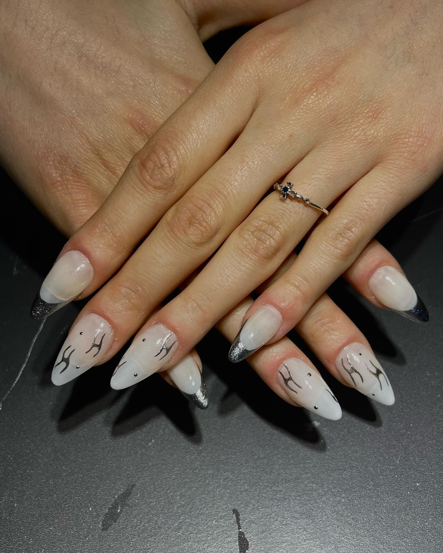 Achieving this minimalist design calls for a base of OPI’s Samoan Sand, layered with a delicate gradient of Alpine Snow. The artful touches can be added with a fine-tip brush dipped in Black Onyx, allowing for precision and a feather-light touch. It’s an ensemble that speaks volumes in whispers.