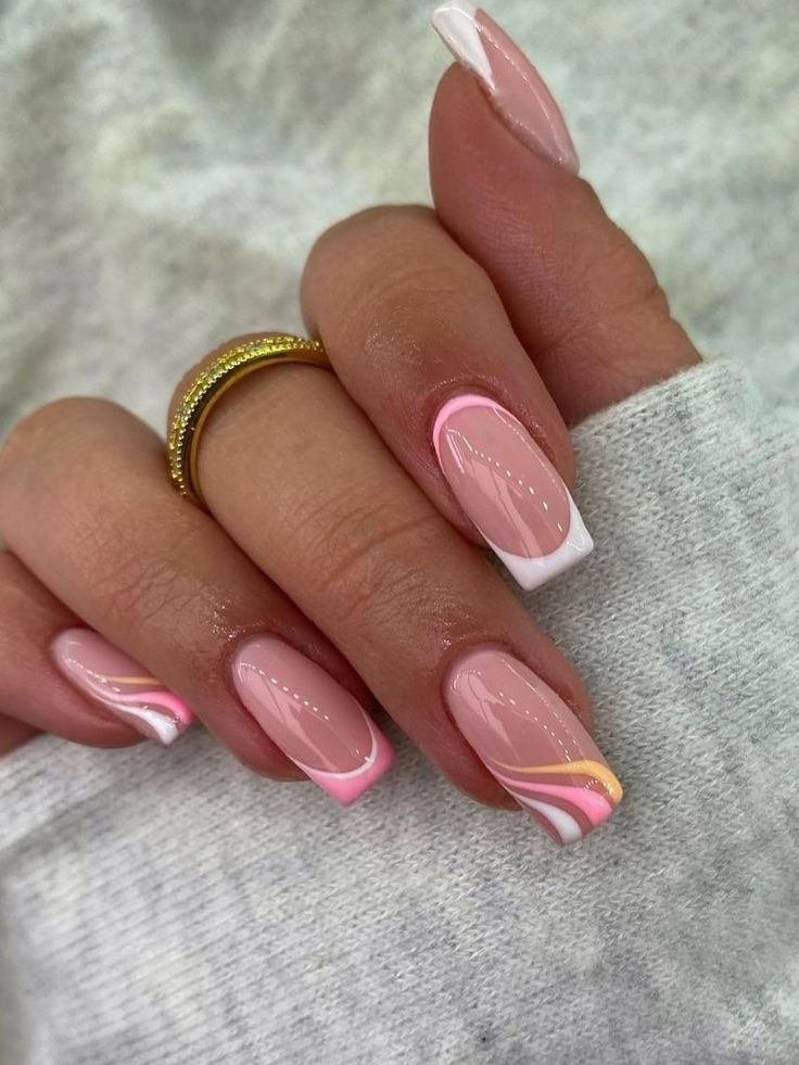 To recreate this pastel perfection, you’d need a high-quality gel polish, like Gelish’s “Pink Smoothie” for the base, and “Arctic Freeze” for the white details. Use a fine brush to swirl the colors gently, achieving that marbled look. A top coat of OPI’s “ProStay Gloss” will give your nails a durable shine.