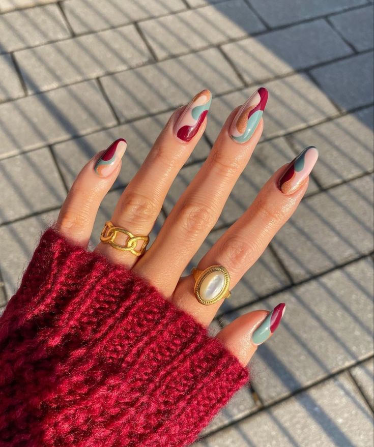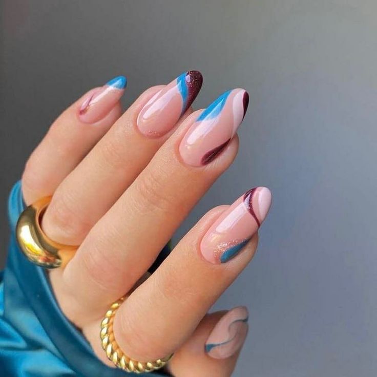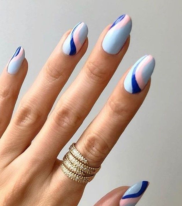 The fusion of april nails ideas acrylic with Easter festivities is beautifully demonstrated in this playful yet chic nail design. Here we see a dynamic combination of color block and swirl patterns that make each nail a canvas for creativity. The base of nude polish sets the stage for bold blue and red swirls, accented by a glittery maroon that provides a touch of glamour. It’s a bold statement that plays on the vibrant side of the April spectrum.