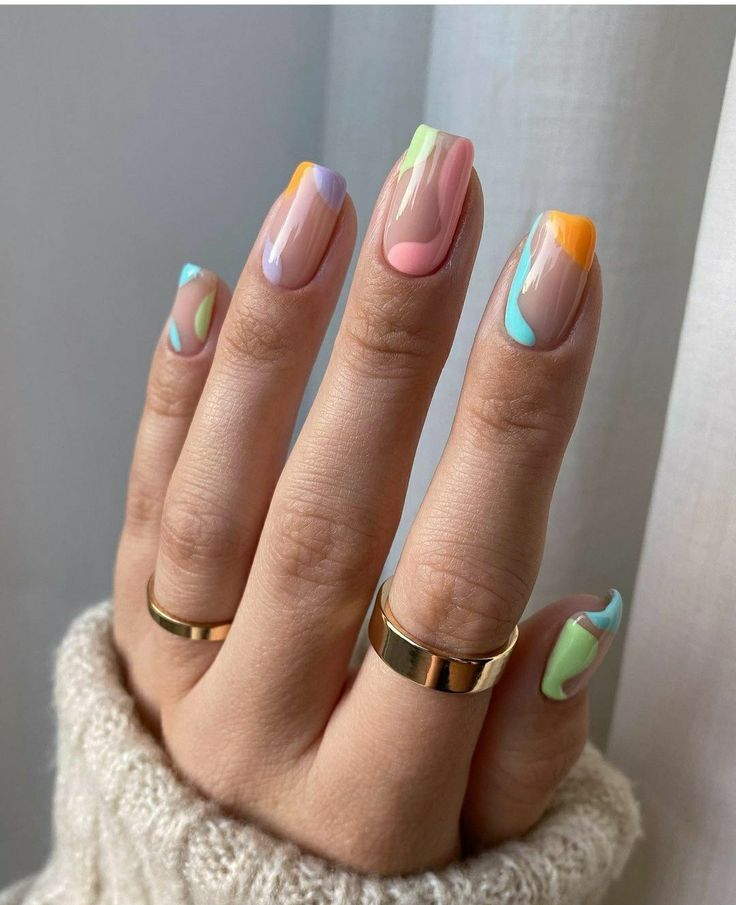 Our design is a serenade to spring itself, featuring soft swirls of pastel colors with bold bursts of orange and blue. The nails have a modern almond shape, providing a perfect backdrop for the free-flowing design. It’s a celebration of the season’s playful side, mirroring the unpredictability of April’s weather in every swirl.