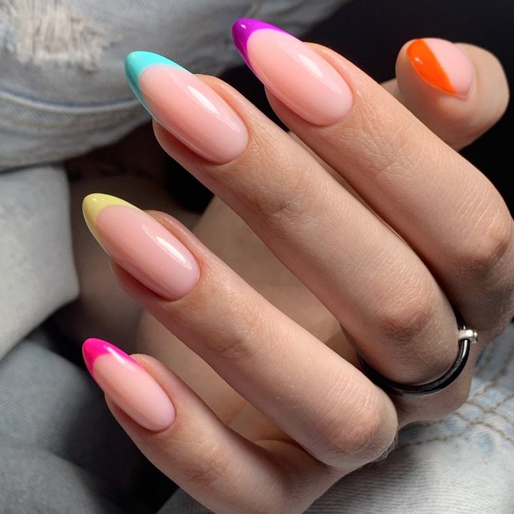 Drawing inspiration from a springtime rainbow, this nail design bursts with April nails ideas that celebrate color in its most vivid form. Each nail boasts a different hue, from sky blue to sunny yellow, deep violet, and grassy green, reminiscent of an Easter morning. The stiletto shape adds an edgy contrast to the playful colors, making this design perfect for those who love to stand out with a statement manicure.