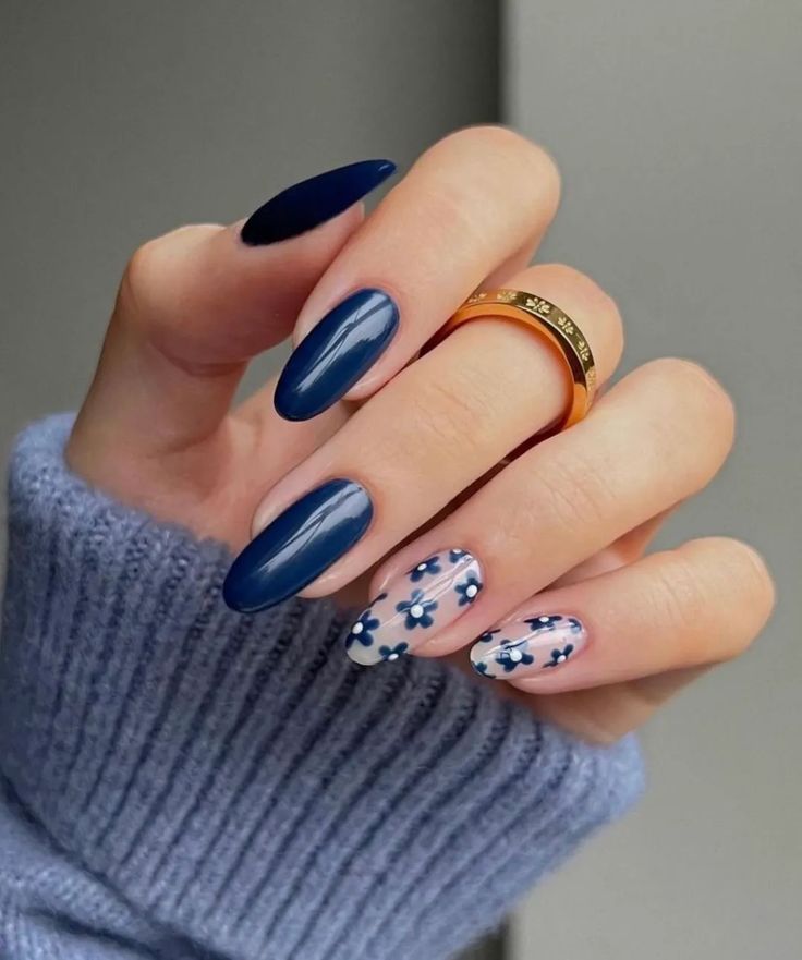 Bold and beautiful, this deep navy manicure with white floral accents is a true representation of march nails ideas acrylic. The contrast between the dark background and the white petals is reminiscent of a midnight garden, making it a dramatic choice for any evening occasion.
