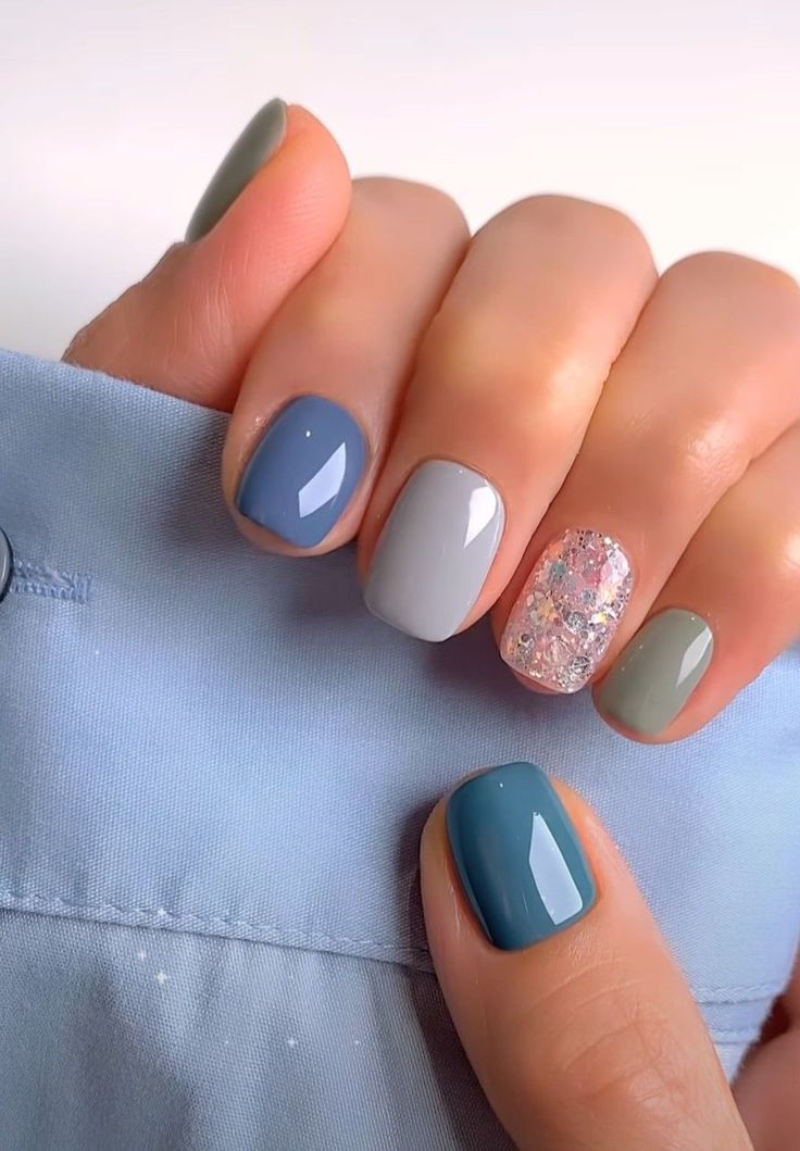 A tranquil teal palette with varying shades and a sparkly accent nail captures the essence of march nails ideas. This serene set suggests the depth of the ocean meeting the sparkle of sunlight on water, ideal for those days when you want to carry a piece of the calm sea with you.