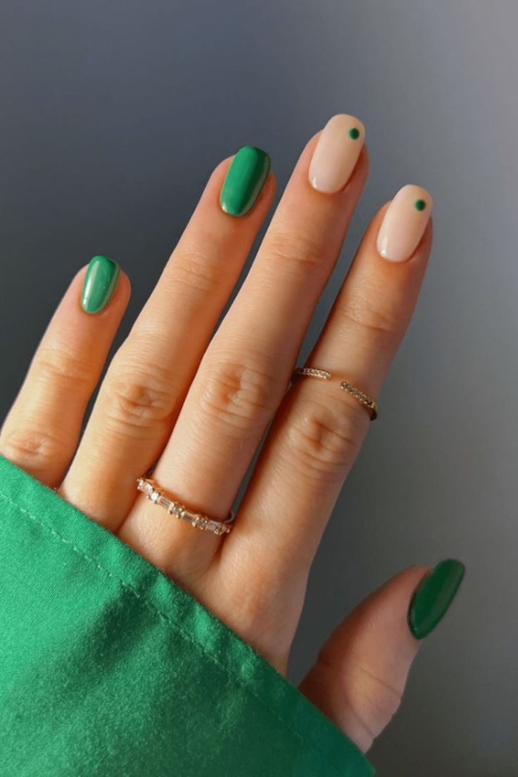 A nod to march nails ideas st. patrick’s day, this design pairs a vibrant green with a nude base, each nail featuring a single green dot as a focal point. It’s a minimalist approach that speaks volumes, perfect for those who appreciate a subtle yet bold statement. This style is versatile, suitable for both a festive occasion and a chic everyday look.