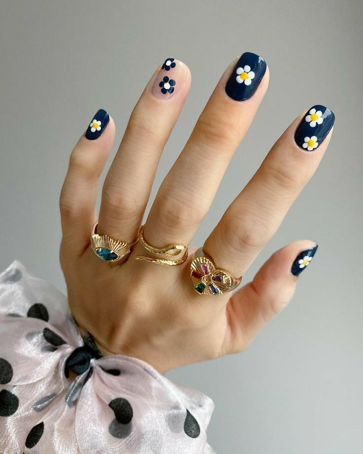 As the day ends, spring nights beckon with their cool air and mysterious allure. Dark blue nails adorned with bright florals capture this enchantment. It’s a style that celebrates the contrast between night and day, the vivid life that thrives in the quiet dark.