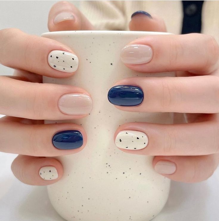 Combining the timeless elegance of nude tones with a deep blue, these nails are a canvas of contrast. Accented with speckled details, they capture the essence of a starry spring night, ideal for a gel polish art design aficionado.