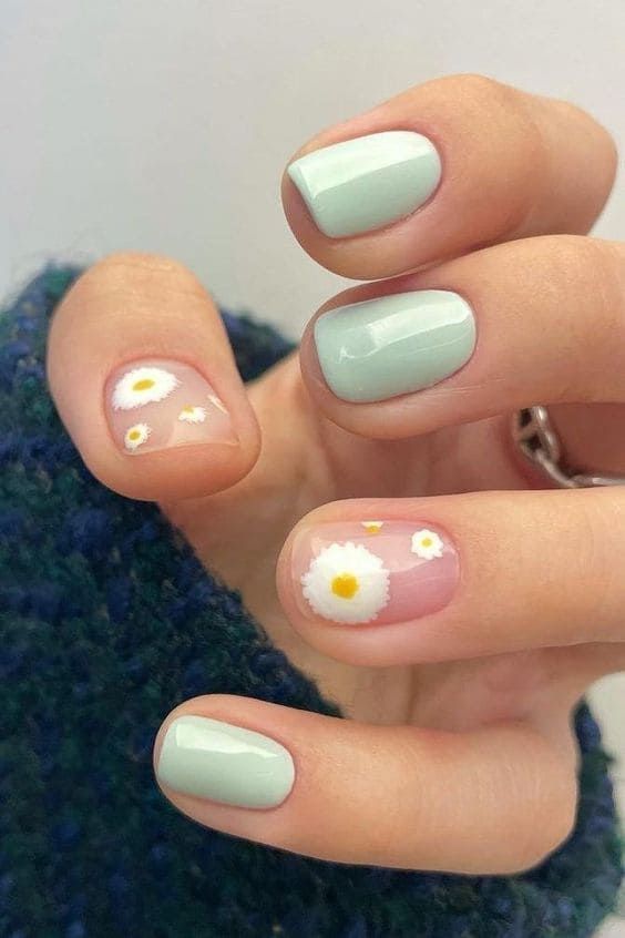 Soft pastel greens serve as the backdrop for charming daisy designs, invoking the feel of a spring meadow on your nails. This design is a breath of fresh air, a perfect match for a pretty spring day.