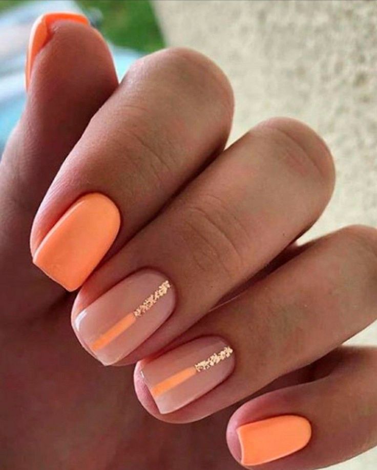 The smooth gradient from a peachy pink to a deeper shade creates a sunset effect, reminiscent of a warm spring evening. The subtle gold flake accent adds a touch of luxury, making it a perfect spring nails colored tips choice.