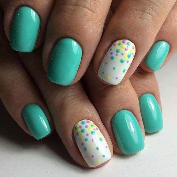 Vibrant teal nails interspersed with a polka dot party nail bring a splash of fun to the mix. It’s a playful take on the spring nails colorful trend, reminiscent of confetti in the air.