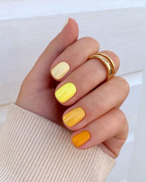 This gradient of yellow shades from pale to bold encapsulates the essence of a sunny spring morning. The transition of colors is smooth, much like the gradual warmth of the sun’s rays, perfect for those who love spring nails color ideas that tell a story.