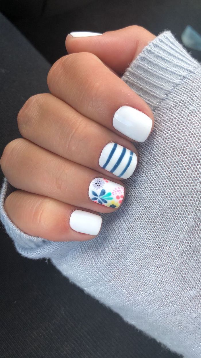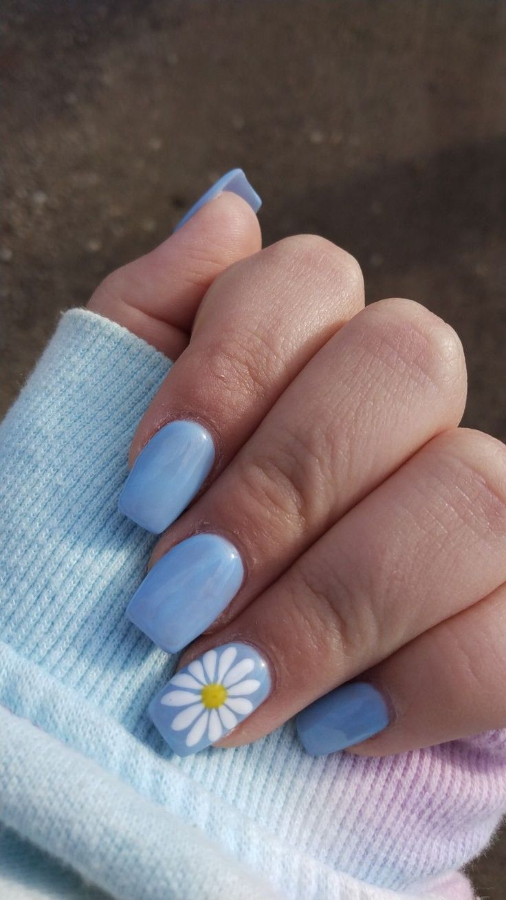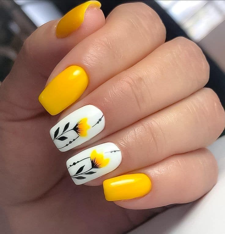 Embrace the warmth of the sun with these manicure nails color that feature a bright sunshine yellow. The bold yellow is complemented by artistic black and white floral designs on the accent nails, evoking the beauty of spring blooms against a clear blue sky. It’s a manicure that’s both vibrant and expressive, perfect for those sunny spring days.