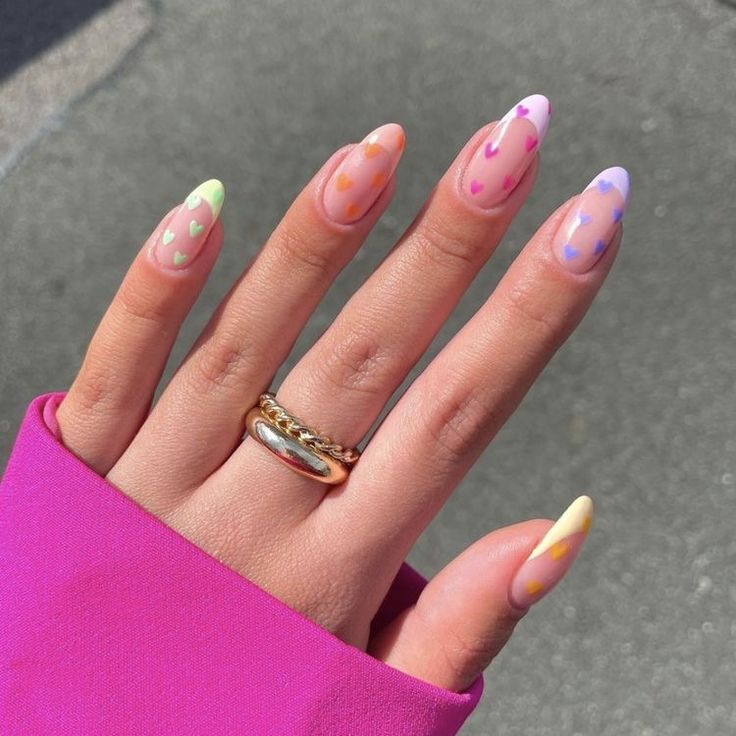 A playful array of pastel shades adorns each nail, forming a delightful rainbow that captures the essence of spring. Each nail different color shades spring into a colorful spectacle, reminiscent of the first rainbow greeting the season’s showers.