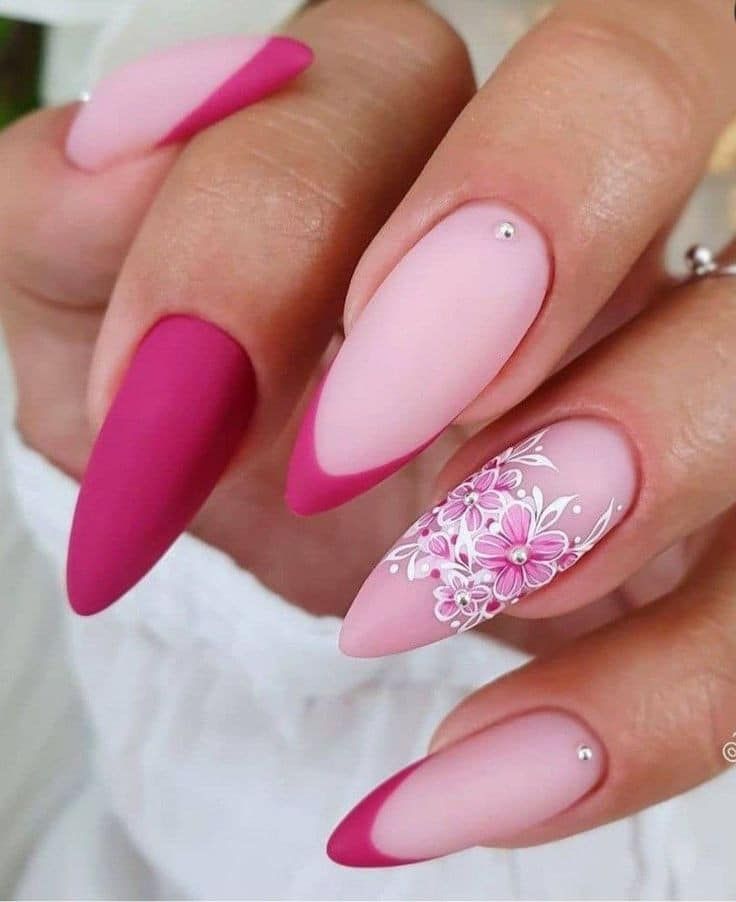 The romance of spring is perfectly encapsulated in the dance of pink hues on these nails. From a delicate baby pink to a bold magenta, the range of pink shades creates a harmonious gradient, celebrating the season’s blossoms. The added floral artwork on one nail, along with the tasteful addition of tiny gems, makes this design both intricate and elegant.