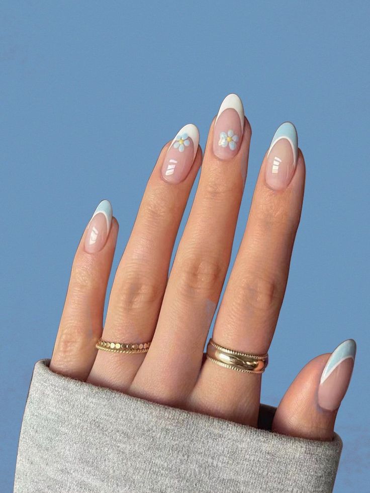 This combination allows for a versatile look that plays with texture and form. The dotting tool is key for those tiny, precise petals. Apply your base color and let it dry. Then, carefully paint a crescent of blue at the tip of the nail, leaving a strip of natural nail in between. On the matte nails, use a dotting tool to create small flowers in white polish. Alternate finishes with matte and glossy top coats for a tactile experience.