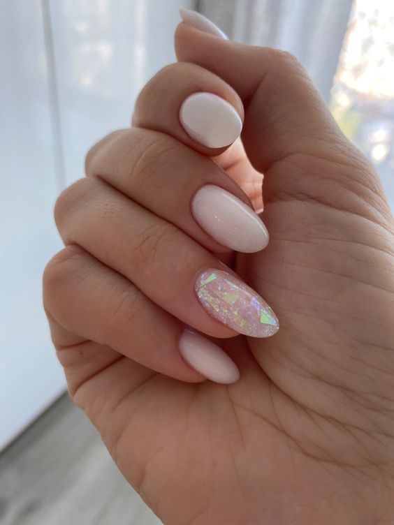 These colors and materials work in perfect harmony to create a subtle yet striking effect. The iridescent flakes, particularly, should be used sparingly to maintain the nail design’s overall delicacy.