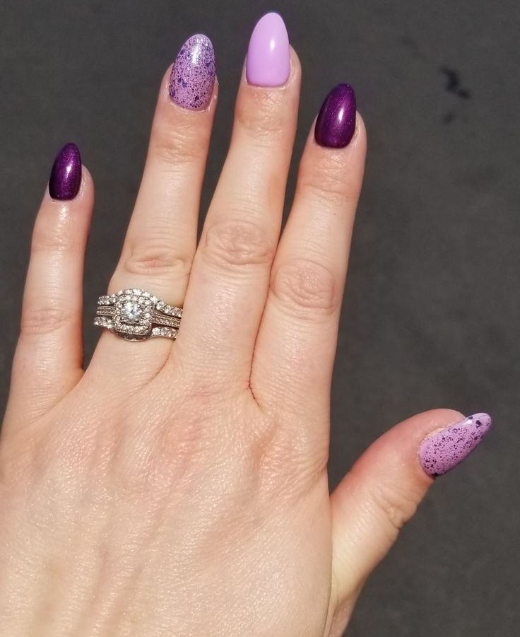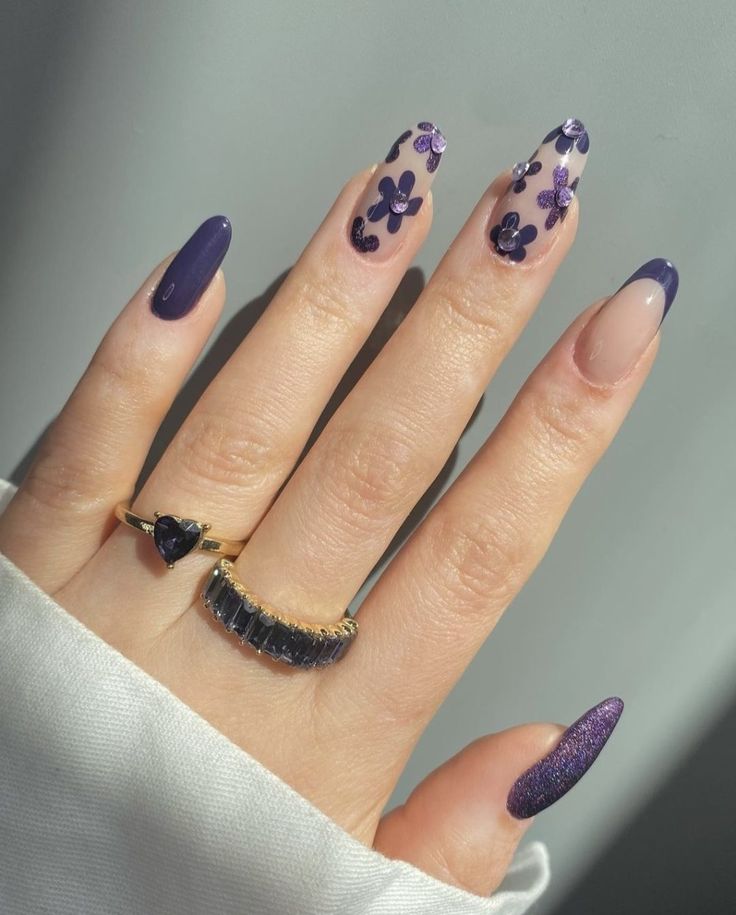 The “Sparkling Amethyst” nails capture the preciousness of gemstones with a combination of matte and glitter textures. These nails are a luxurious addition to the nail ideas for spring acrylic purple palette, reflecting the richness and depth of purple gemstones, ideal for a sophisticated night out.