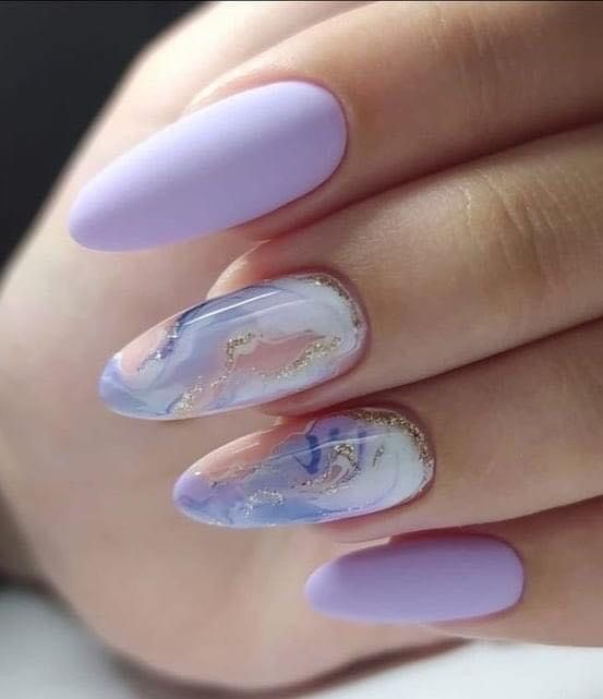 Lastly, the Enchanted Marble nails are a mesmerizing combination of purple hues, gold flecks, and marble effects, offering a modern twist on classic acrylic nails. This design is for the trendsetter, the woman who walks the line between high fashion and the artistry of pastel spring days.