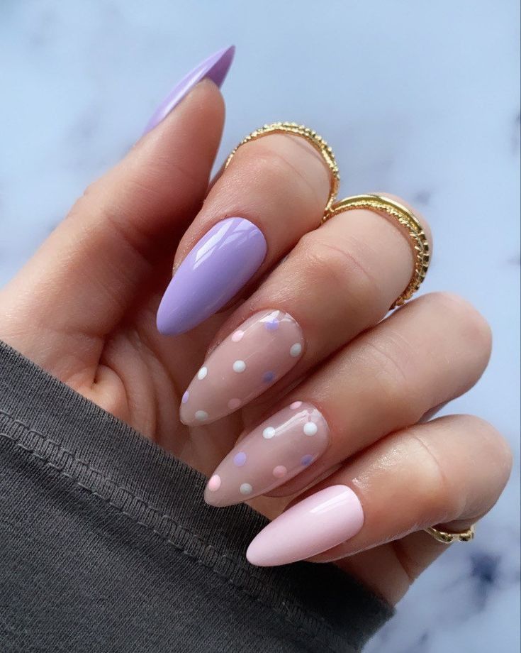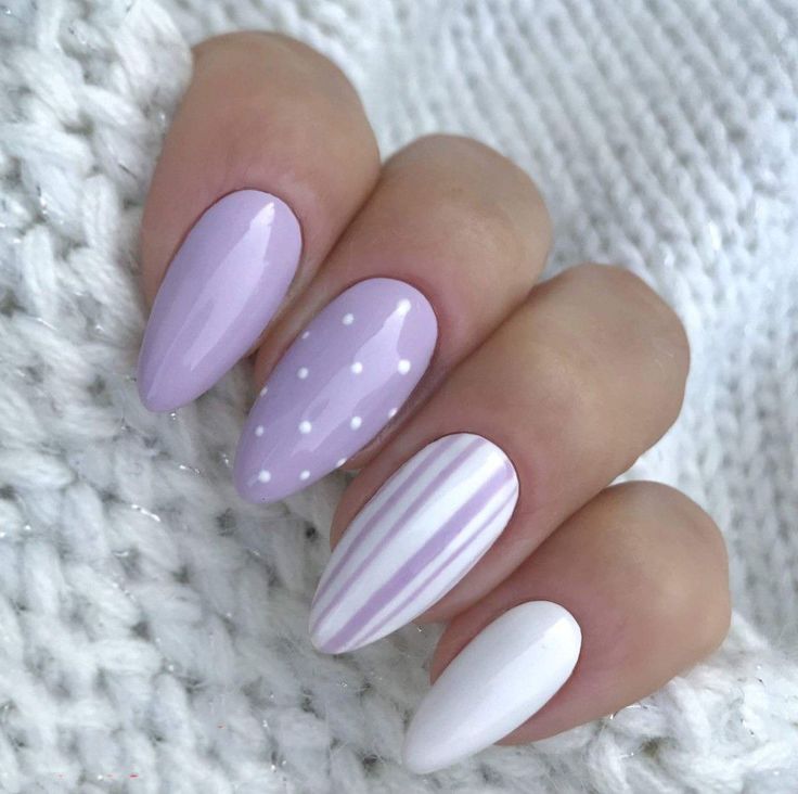 The “Playful Polka and Stripes” nails are a fun and whimsical take on classic patterns. Alternating between solid lavender, white with purple stripes, and white with delicate polka dots, these nails are a playful nod to the spring nail art purple trend. They embody a youthful spirit, perfect for the springtime joy and are a charming choice for a casual spring day out.