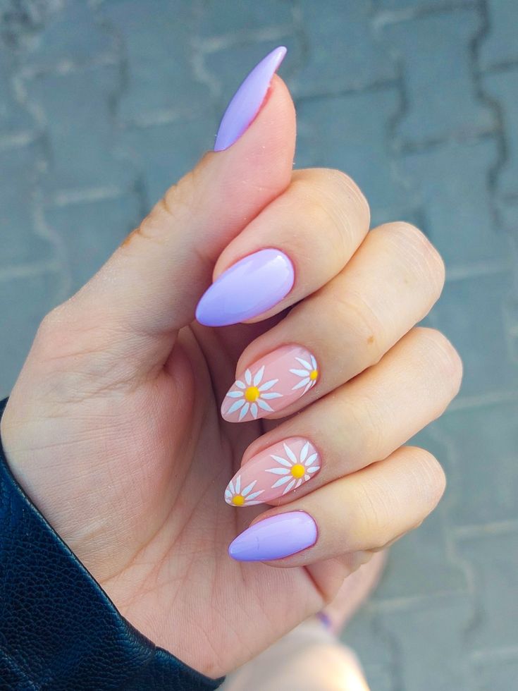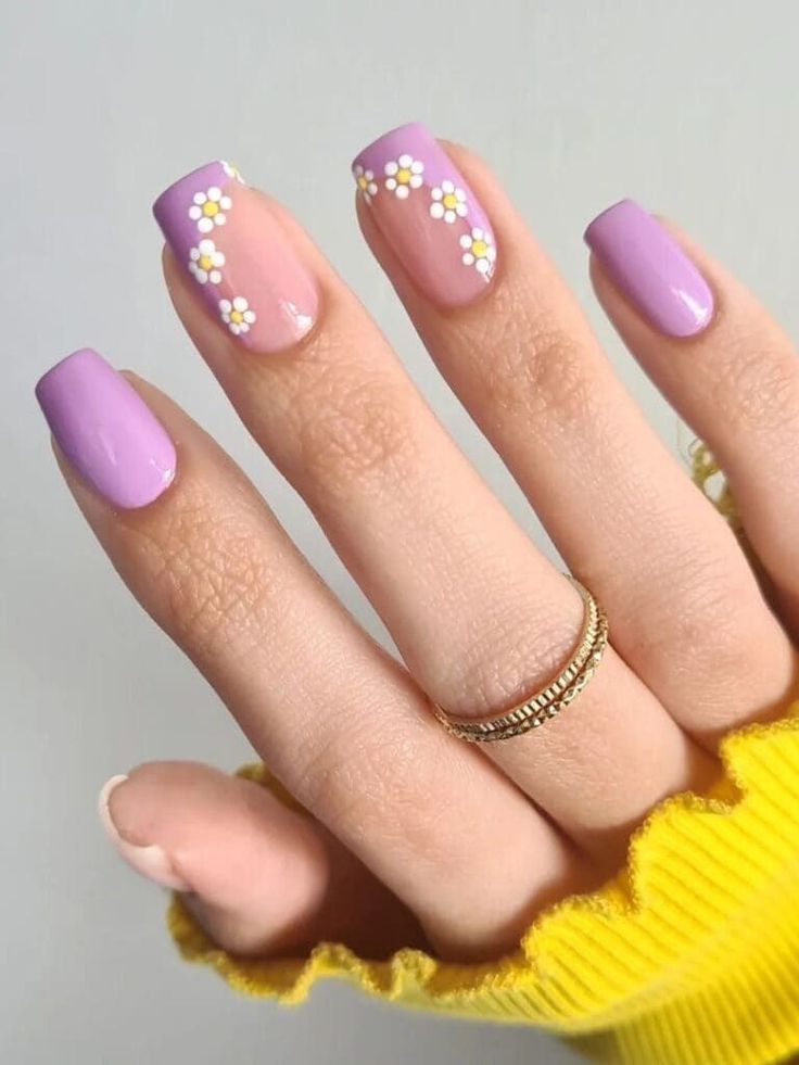 “Daisy Delights” features a soft lilac base graced with dainty daisy designs, encapsulating the essence of spring flower nail designs purple. This cheerful and fresh look is an instant mood lifter and ideal for those looking for spring nail ideas purple that reflect the blossoming nature around them.