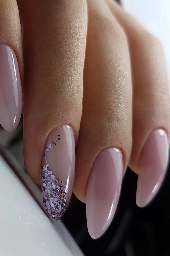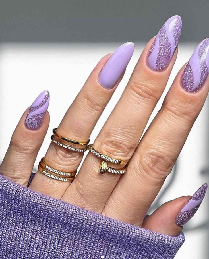 For a touch of glamour, the “Glitter Crescent” design is a showstopper. Combining a sleek, light purple base with a dazzling crescent of glitter on the accent nail, this design offers a sophisticated take on spring nail colors purple. It’s a perfect blend of subtlety and sparkle for an elegant evening affair.