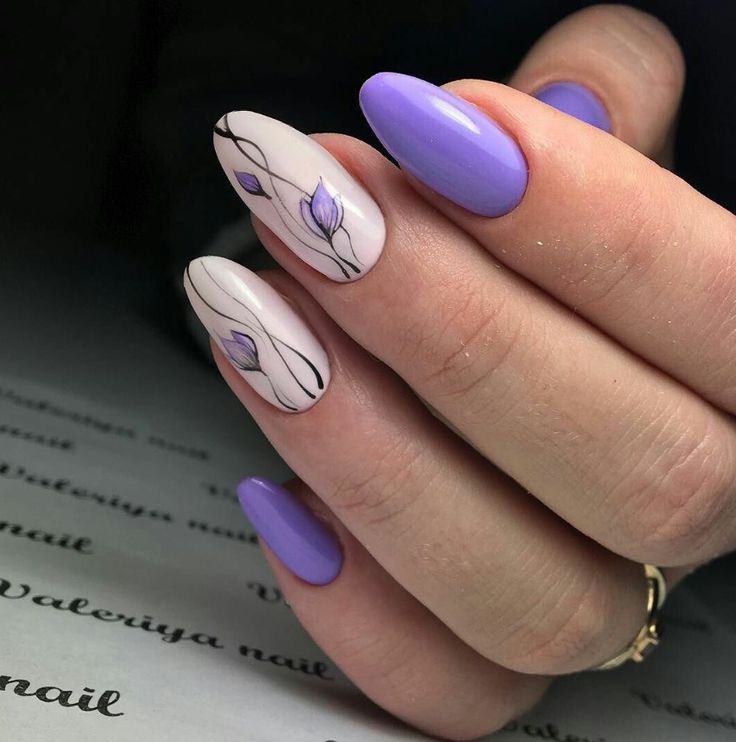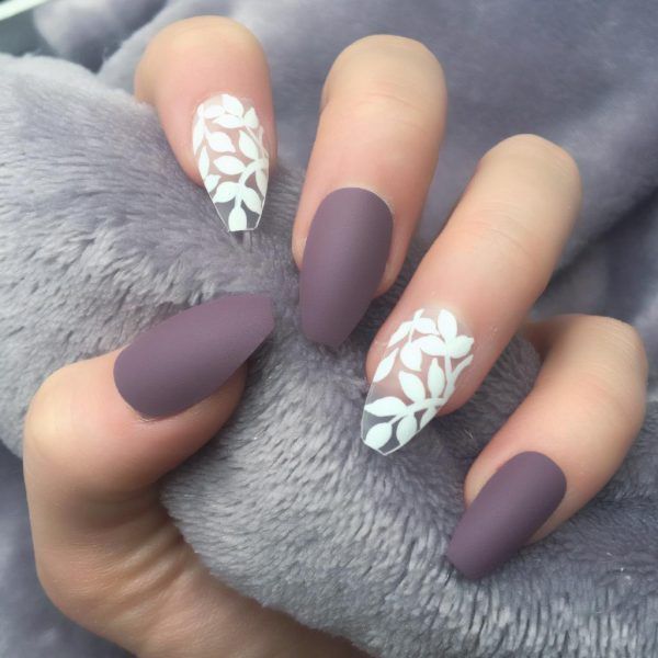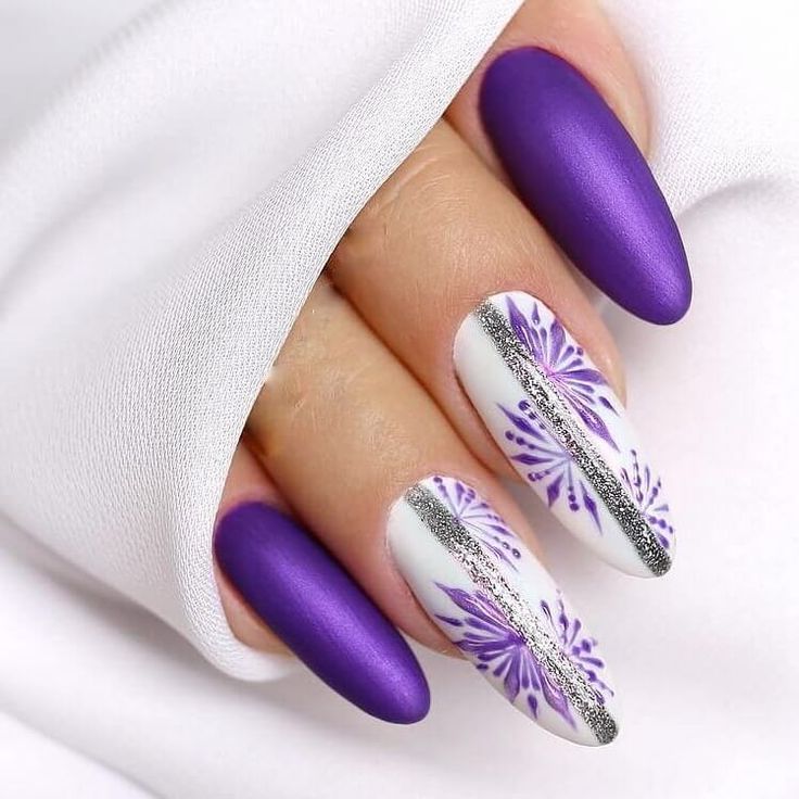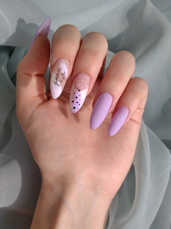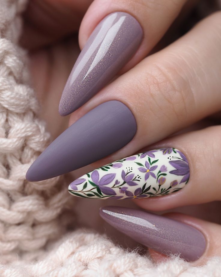 The Matte and Glossy Fusion is a masterful play of textures. Matte spring nail colors purple create a chic, understated base, while glossy leaves in a lighter shade add an unexpected twist. This look is ideal for the woman who appreciates the subtlety in nail art designs for spring purple, making a statement with finesse rather than flash.