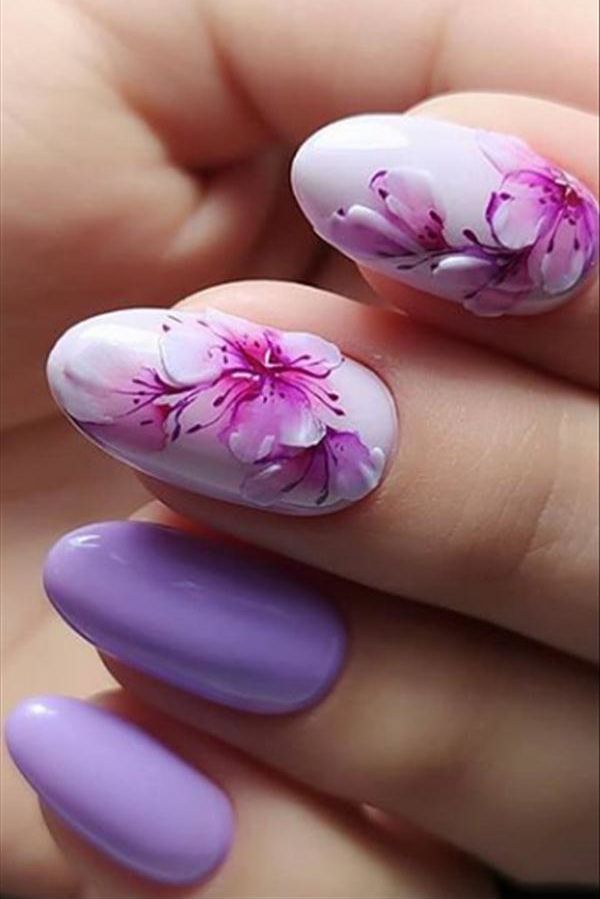 Finally, “Blossoming Art” nails are a canvas where art meets fashion. The white base serves as a backdrop for stunning purple blossoms, creating a delicate and romantic style that is perfect for any springtime event where you want to make a statement with your nail art designs for spring purple.
