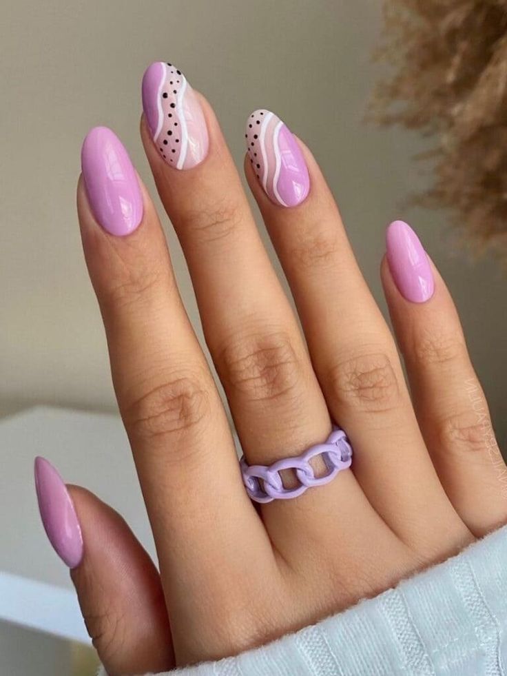 “Polka Dot Dream” combines various shades of purple and white to create a dreamy and feminine aesthetic. With a mix of solid, polka dot, and ombré designs, these nails are a playful take on short nail designs spring purple, perfect for those who love to mix patterns and textures.