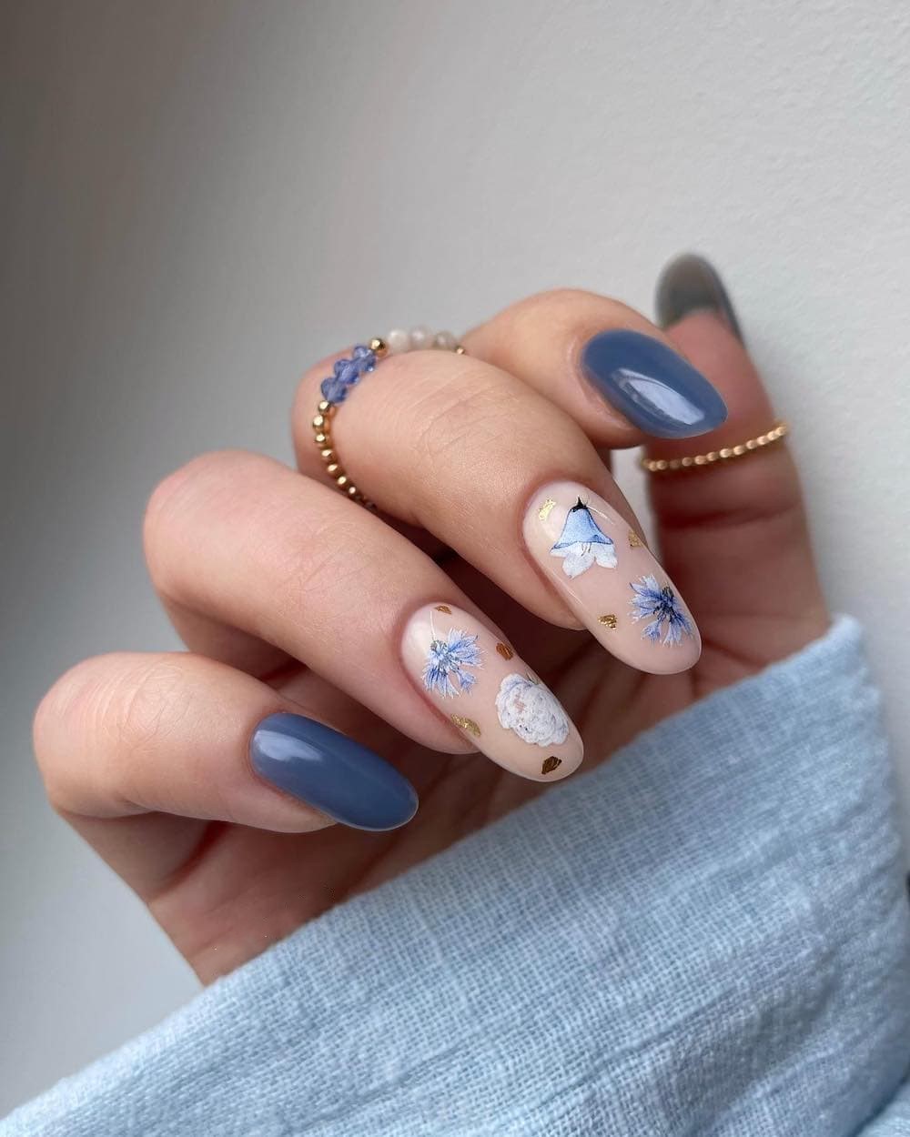There’s a soft elegance that comes with the classic round nail shape, especially when adorned with a pastel blue color that mirrors the clear spring sky. Sprinkled with delicate floral designs and a touch of gold embellishments, this manicure whispers the arrival of spring. It’s a nod to the serene beauty of the season, ideal for a spring nails round shape enthusiast looking for a blend of tradition and trend.