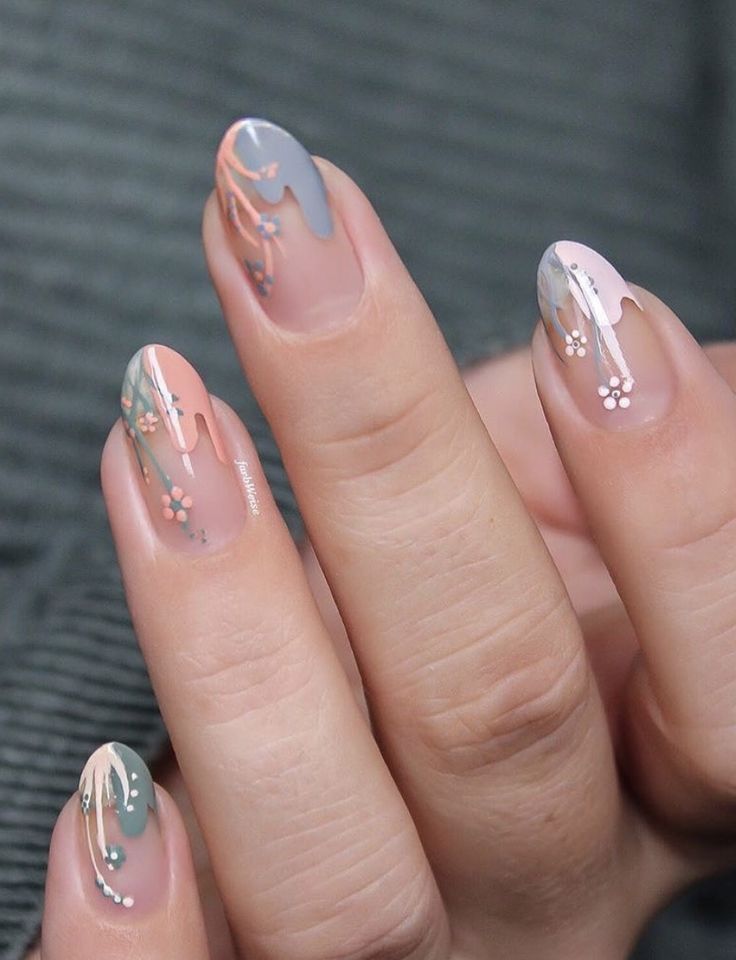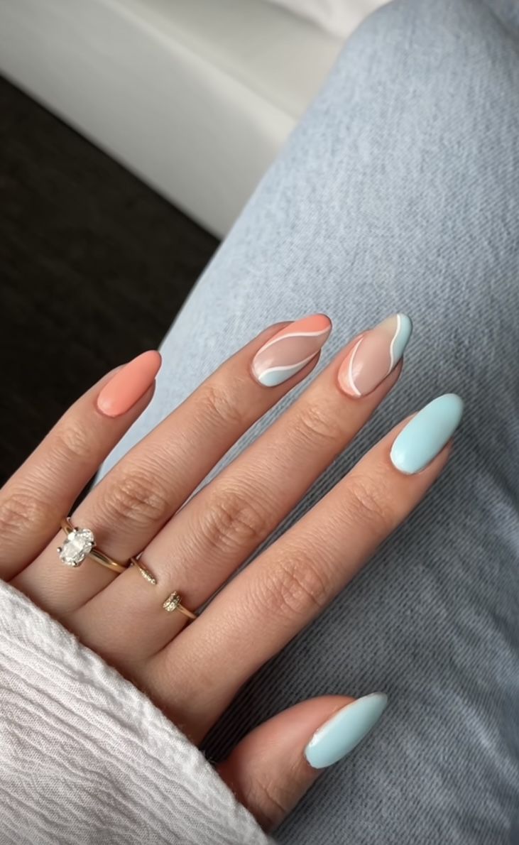 Capturing the essence of modern sophistication, this round nails spring design features a delightful interplay of neutral shades with geometric precision. The soft peach and sky blue tones are a nod to the round nails spring colors, while the white detailing adds a crisp, clean edge. Perfect for those seeking a chic, contemporary look, this style embodies the ideas of a fresh, trendy approach to spring nails round shape. It’s a design that would pair seamlessly with a sophisticated brunch outfit or a smart-casual work ensemble, offering versatility and style.