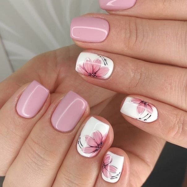 A testament to short round acrylic nails spring, this design showcases a delicate pink hue, providing a canvas for the intricate floral artwork that blooms boldly on the accent nails. This manicure echoes the ideas of rebirth and beauty synonymous with spring, making it a favorite for anyone seeking a blend of artistry and femininity.