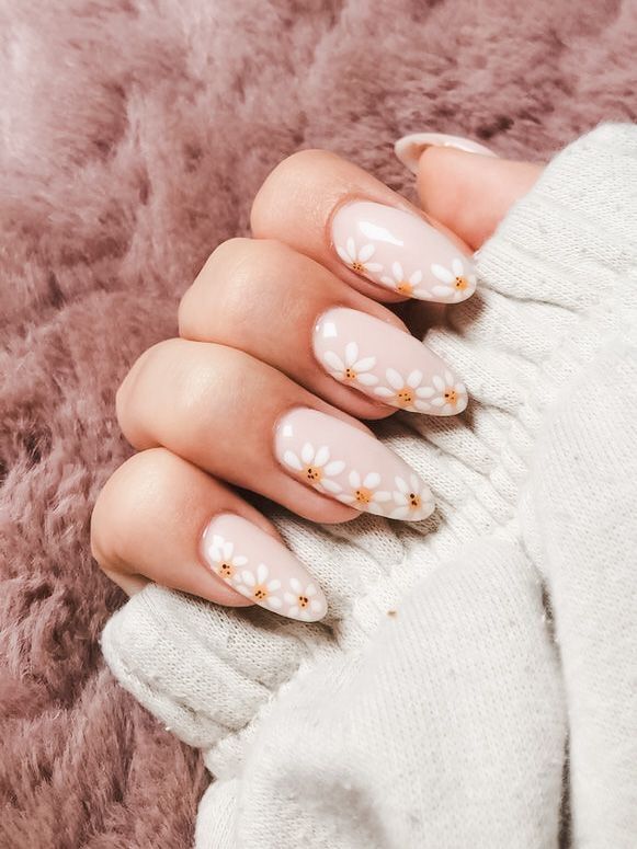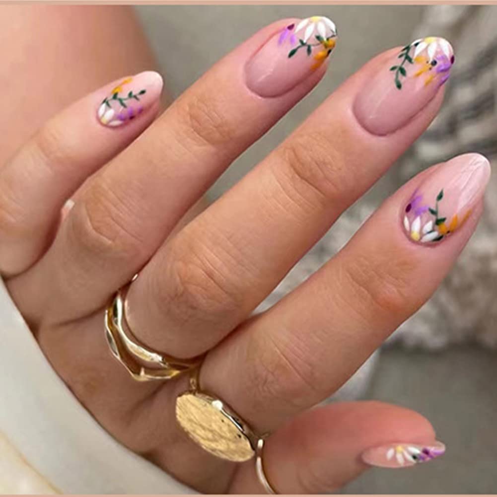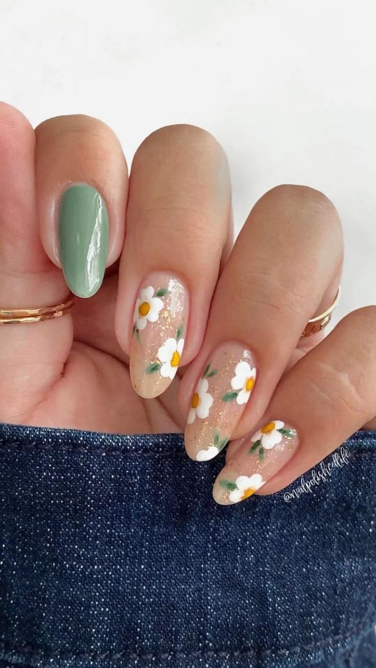 Spring is nature’s way of saying ‘let’s party,’ and what better way to join in than with a manicure inspired by its hues? Sage green offers a fresh, earthy backdrop to the whimsical daisy patterns scattered across a clear base, echoing the colors summer is soon to bring. For those who prefer a softer approach to their round acrylic nails spring selection, this design is a breath of fresh air.