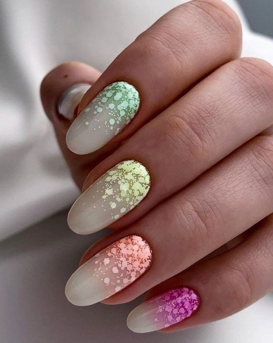 Capture the playful side of spring with nails that blend a soft ombre with a speckled glitter overlay, reminiscent of a freshly laid clutch of Easter eggs.