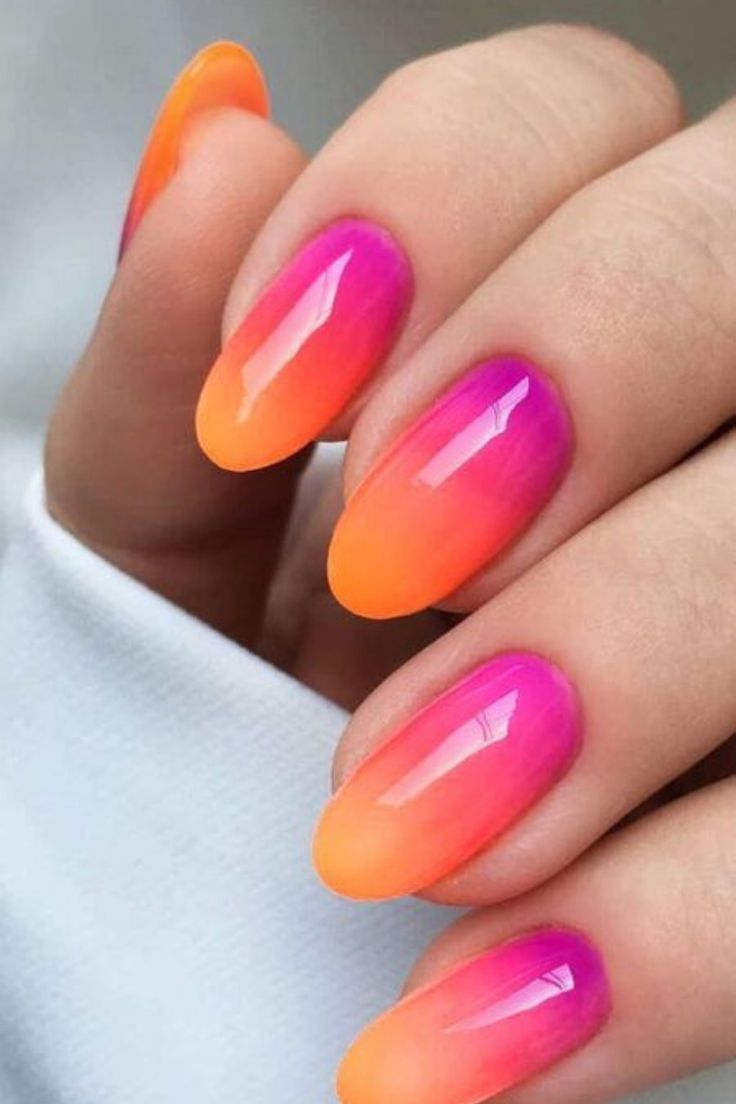 Embrace the dynamic color combos of a spring sunset with this vibrant ombre style. The nails transition from a fiery orange to a passionate pink, reminiscent of the skies at dusk. This design is for the bold at heart, those who love to make a statement with their color choices.