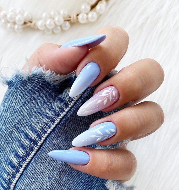 Blue skies and calm seas are captured on your fingertips with this serene ombre effect. The design showcases various pastel colors, from sky blue to soft lilac, adorned with delicate white art designs that evoke the first blossoms of spring.