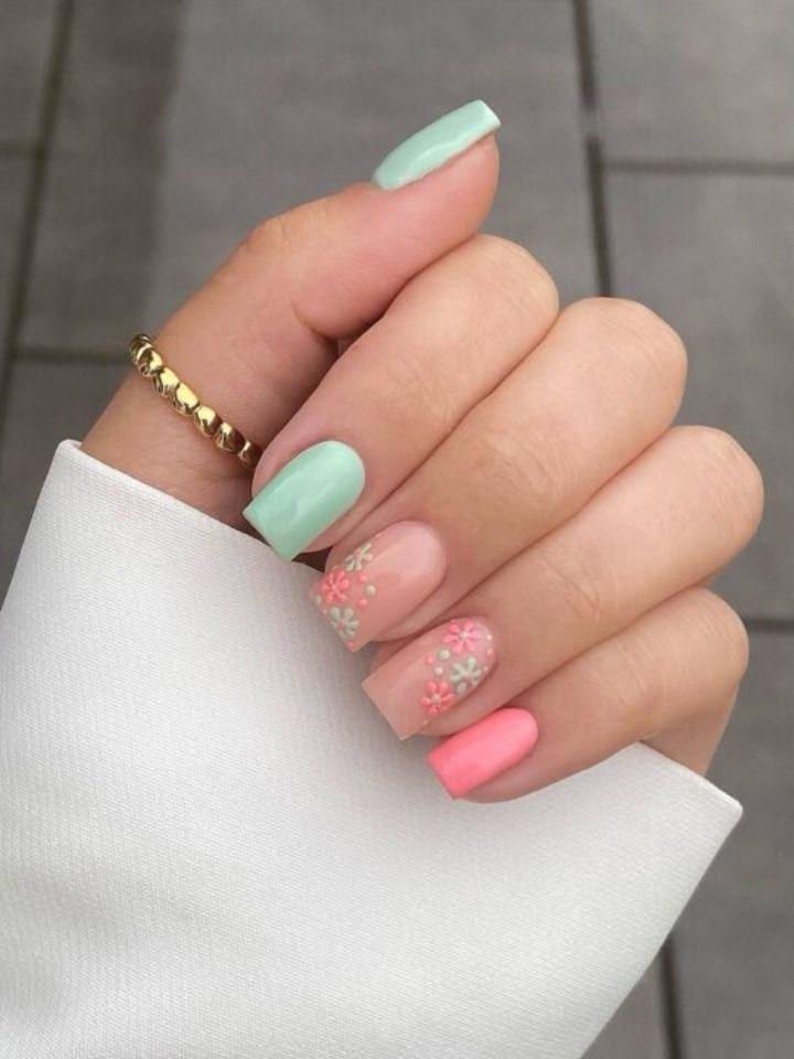 The nails alternate between a refreshing mint green, a neutral pink, and a transparent base with delicate floral art. This design is the embodiment of spring nail color ideas that are effortlessly chic and cute.