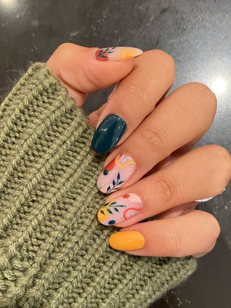 In photo takes the spring theme to a vibrant level with a mix of sunny yellow, deep teal, and artistic floral patterns on a clear base. This design is for those who like their nails to make a bold statement.