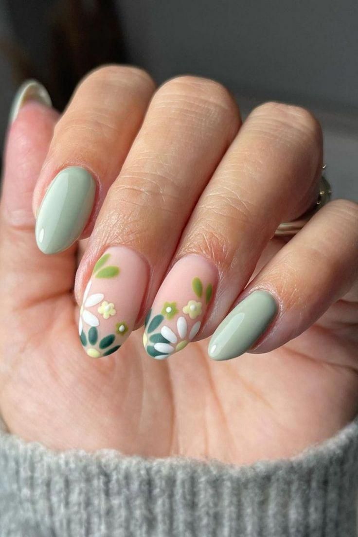 This nail art features a combination of full-color nails and detailed floral patterns. The mix of sage green and pink, accompanied by floral artwork, speaks to the spring nail color trends that are both Fun and Elegant.